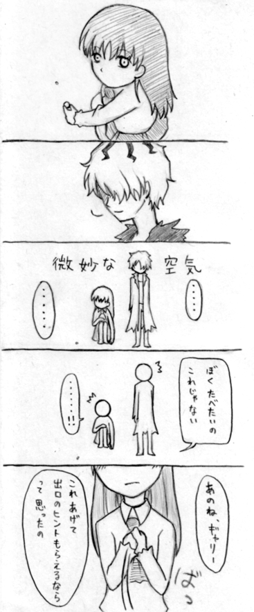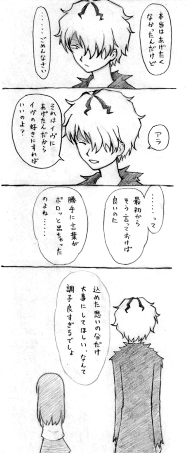 ネタバレ落描き漫画 Ib 2013年03月26日 ※ver1.04ネタバレギャリイヴです そりゃ自分があげたものを人にあげられたらいい気持ちはしないけど、かと言って不快感を露にするでもなく茶化すでもなくあの台詞がこぼれたのかと思うと!!もう!!!イヴはイヴでギャリーに助け守ってもらってるからギャリーのためにも脱出することを最優先に考えてのあの行動だったら萌える!という背景もあります。あのシーンからここまで妄想を膨らましてしまう私の頭はもうダメですね。でも楽しい!追加要素にギャリイヴを見出すのが楽しくて幸せ!!